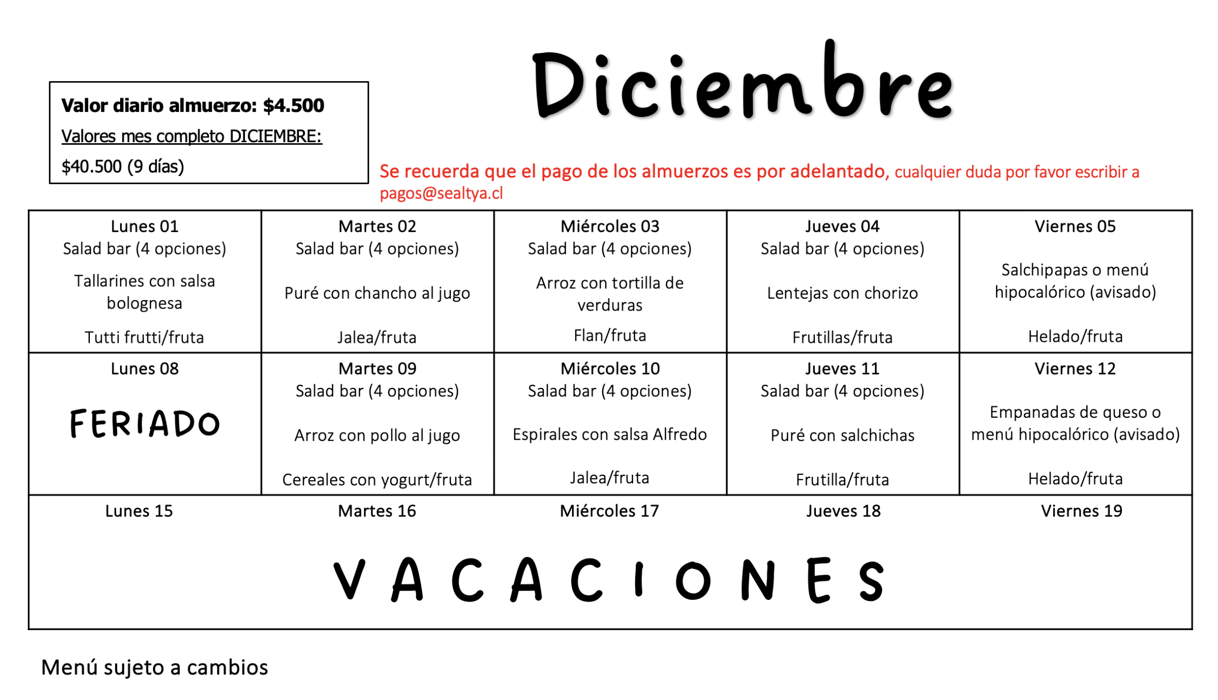El menú se publicará mensualmente para que las familias puedan planificar con anticipación. Te invitamos a revisar el menú de este mes en el siguiente enlace.